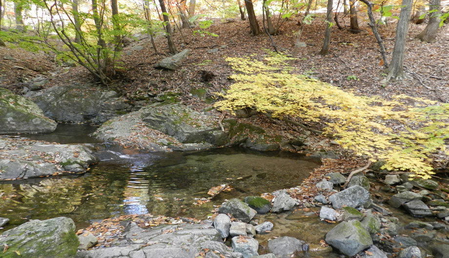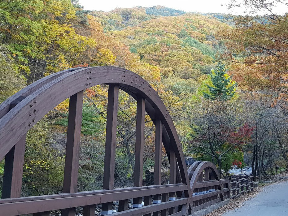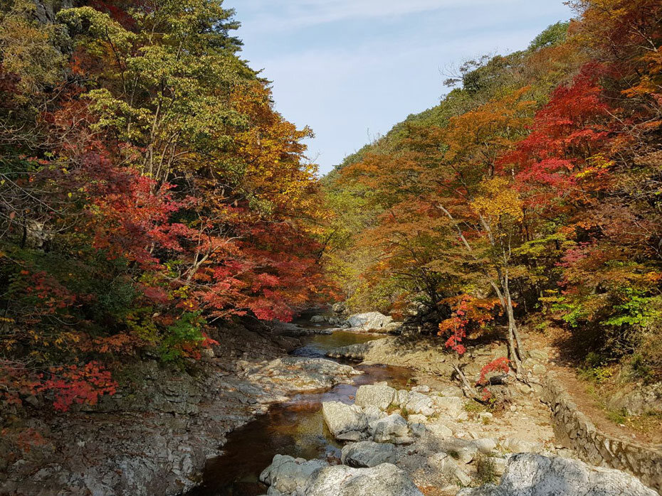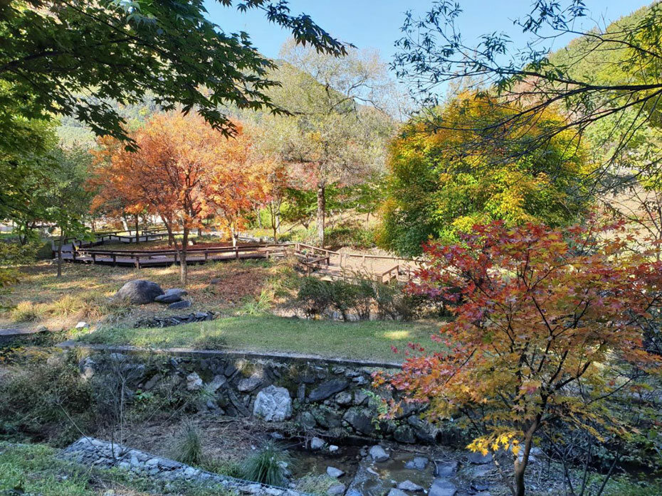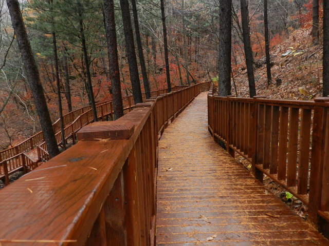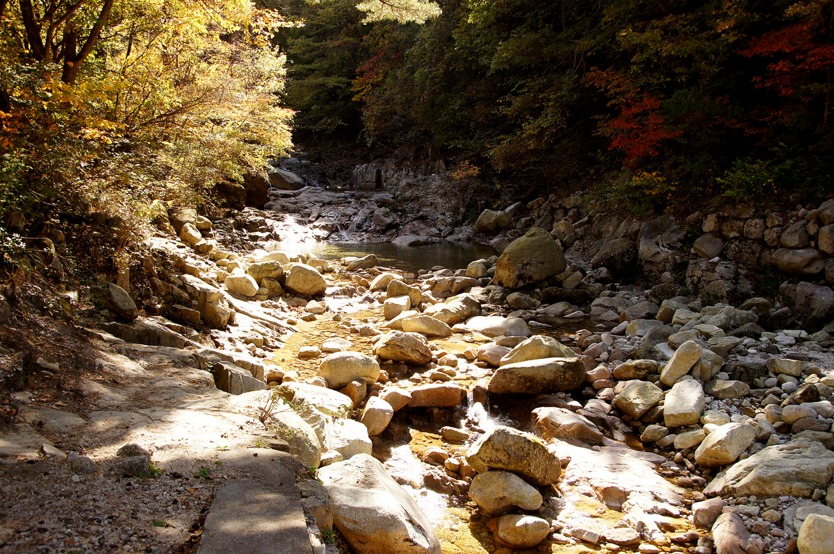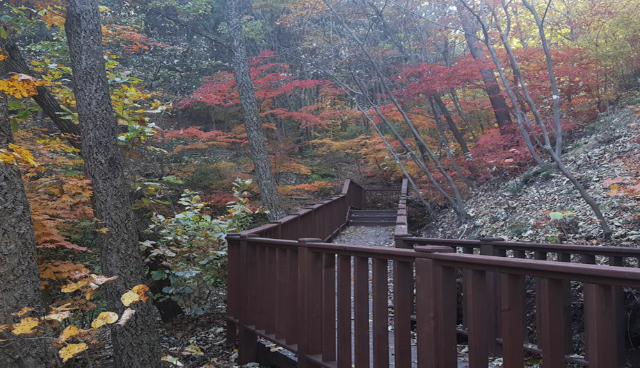 참나무류가 많은 천연림 지대와 낙엽송, 잣나무 등을 심어놓은 인공림 지대가 함께 어우러져 풍광이 뛰어납니다. 기암괴석과 계곡을 따라 완경사, 급경사가 조화를 이룹니다.