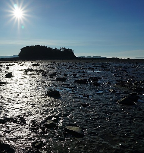 왼쪽은 진흙밭이고 오른쪽은 모래와 자갈이 섞여 있습니다. 제부도에 건너가면 작은 섬답지 않게 볼거리가 많이 있습니다. 매들의 보금자리인 "매바위"가 있고, 또 길이가 2.5km 정도의 조개껍질이 섞인 모래밭으로 이루어진 해수욕장이 있습니다.
