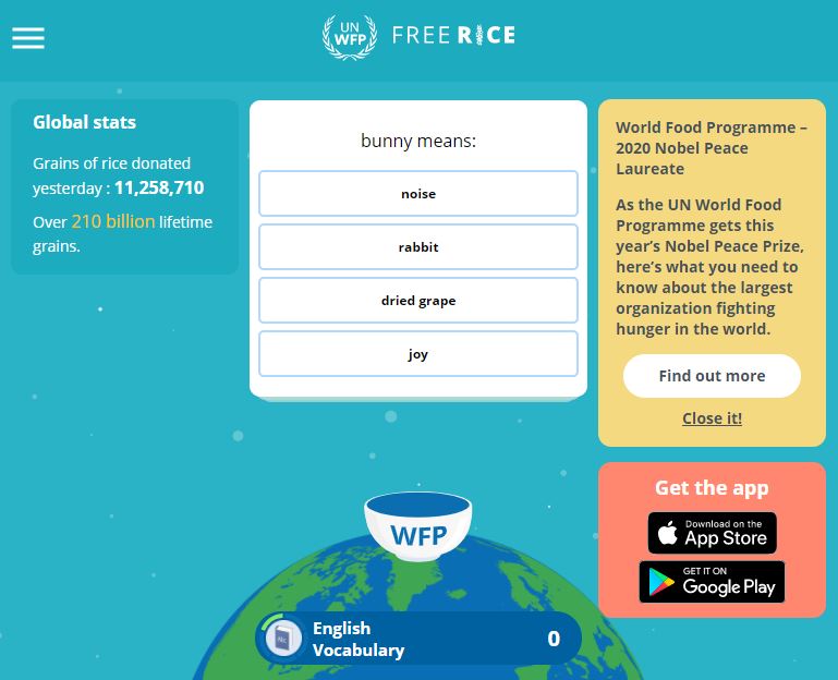 7년 전에 영어공부를 하면서 알게 된 사이트가 있습니다. 영어 단어 등의 퀴즈를 푼 만큼 세계의 빈곤국가에 있는 아이들에게 쌀을 기부해주는 FreeRice.com입니다. 바쁘다고 한동안 뜸하다가 영어공부하겠다는 지인에게 소개해 줄 요량으로 이번에 다시 들어가 보니 아주 깔끔하게 재 단장되어 있네요.