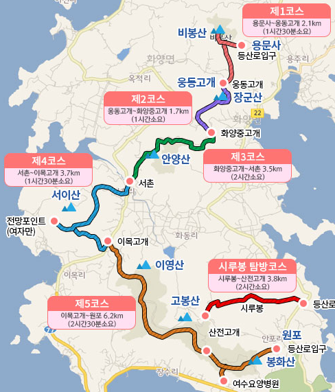 곡화목장 둘레길은 총 17.2킬로의 5개 코스로 구성되어 있으며 천혜의 경관을 간직한 장수만, 여자만 등을 구경하며 힐링을 할 수 있는 둘레길입니다. 비봉산, 용문사, 웅동 고개, 안양산, 서이산, 이영산, 고봉산, 봉화산, 원포마을 등을 아우르는 코스로 원하시는 곳을 선택하여 걸을 수 있는 곳입니다.