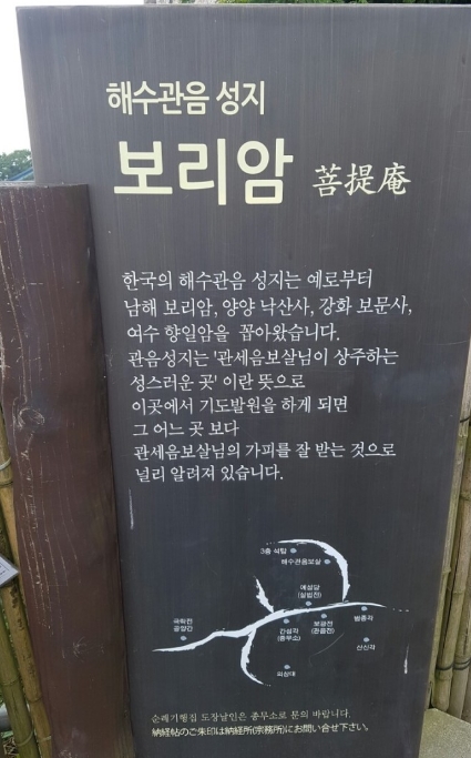 남해의 금산 보리암은 상주면 상주리 금산 남쪽 봉우리 해발고도 681m 절벽 위에 위치한 절입니다. 금산의 정상에 자리 잡고 있는 보리암은 금산의 온갖 기이한 암석과 푸르른 남해의 경치를 한눈에 볼 수 있는 아름다운 사찰입니다.