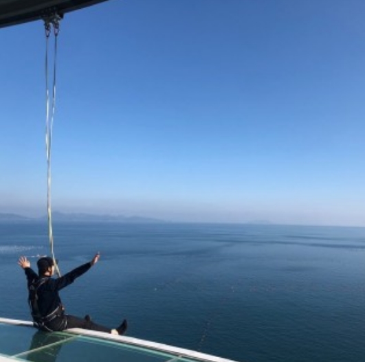 스카이워크 체험은 위에서부터 내려오는 하네스를 착용하고 미끄럼 방지 신발로 갈아 신은 후 밖으로 나가서 전망대를 한 바퀴 도는 코스로 체험 시간은 3-5분 정도 소요됩니다.