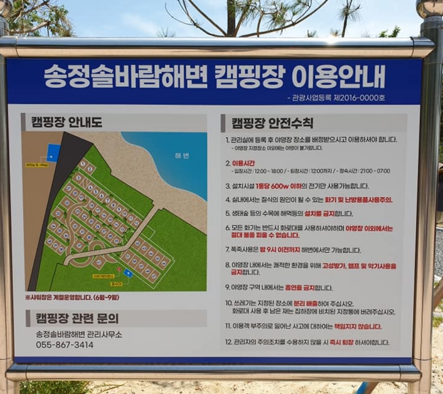 - 송정 솔바람 해변 캠핑장 이용요금 : 1박 2만 원, 입장시간 12:00 ~ 18:00 / 퇴장시간 : 익일 12:00